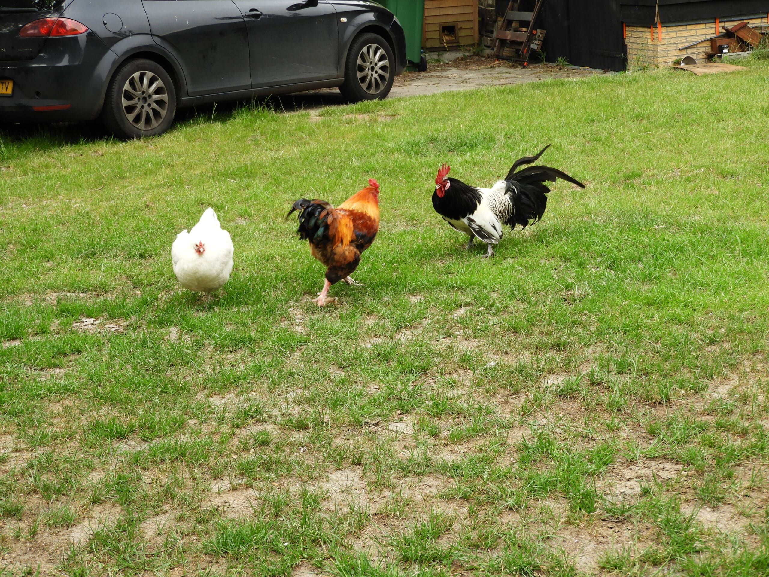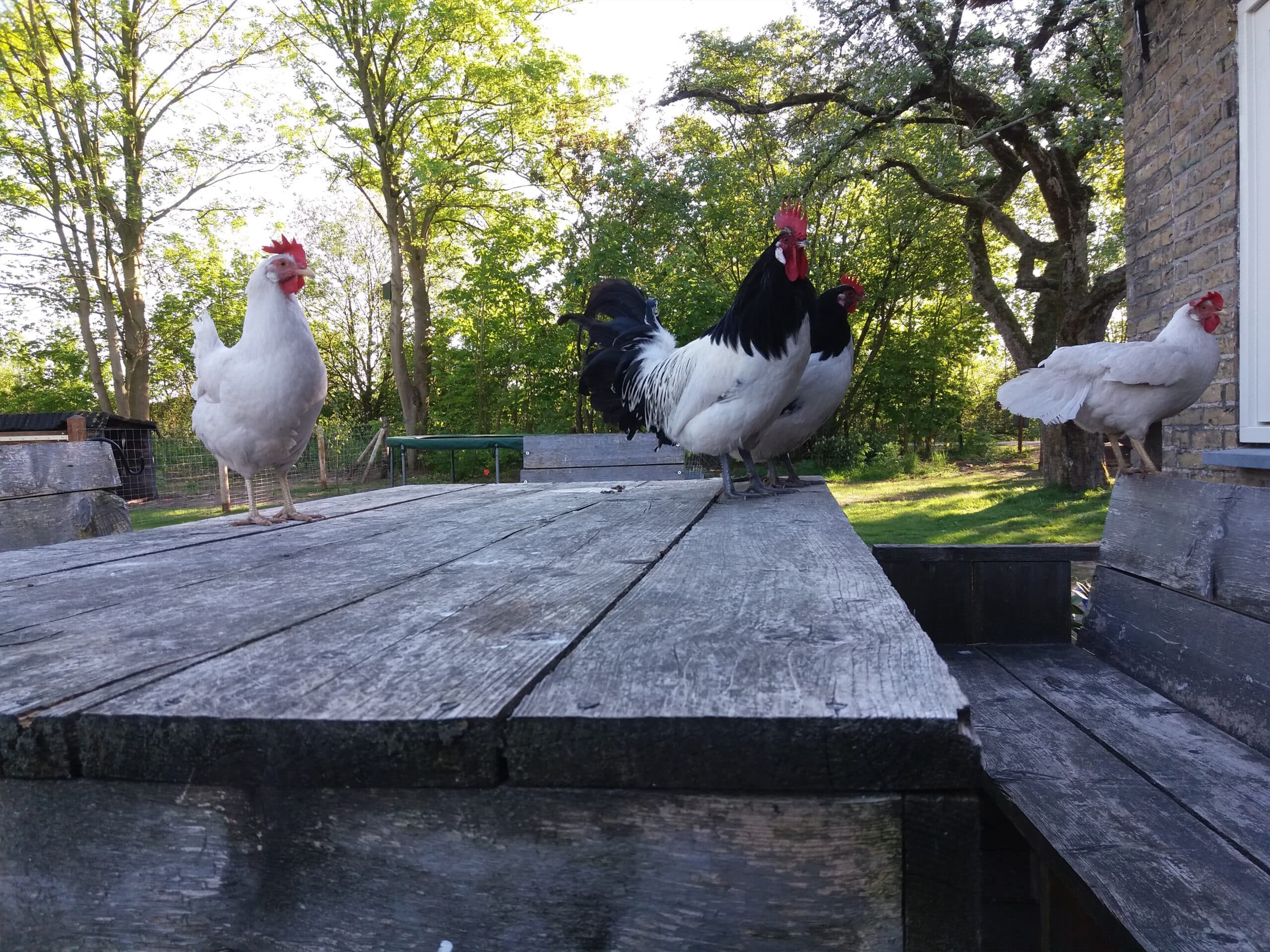 Dan hebben we de kippen en de 3 hanen die overal rond scharrelen en het liefst op ons terras in de zon zitten. Dierenartsen A7 Noord komt bij ons voor controle en bij ziekte, zoals bv op een zondag na een spoed operatie hier in het hok. Onze oudste geit van 16 jaar had een wond bij haar oog. Waar het eerst leek goed te komen met een pijnstiller en oogzalf liep dat door de stress ineens anders. Het oog moest helemaal verwijderd worden. Gelukkig is hetallemaal goed gekomen.