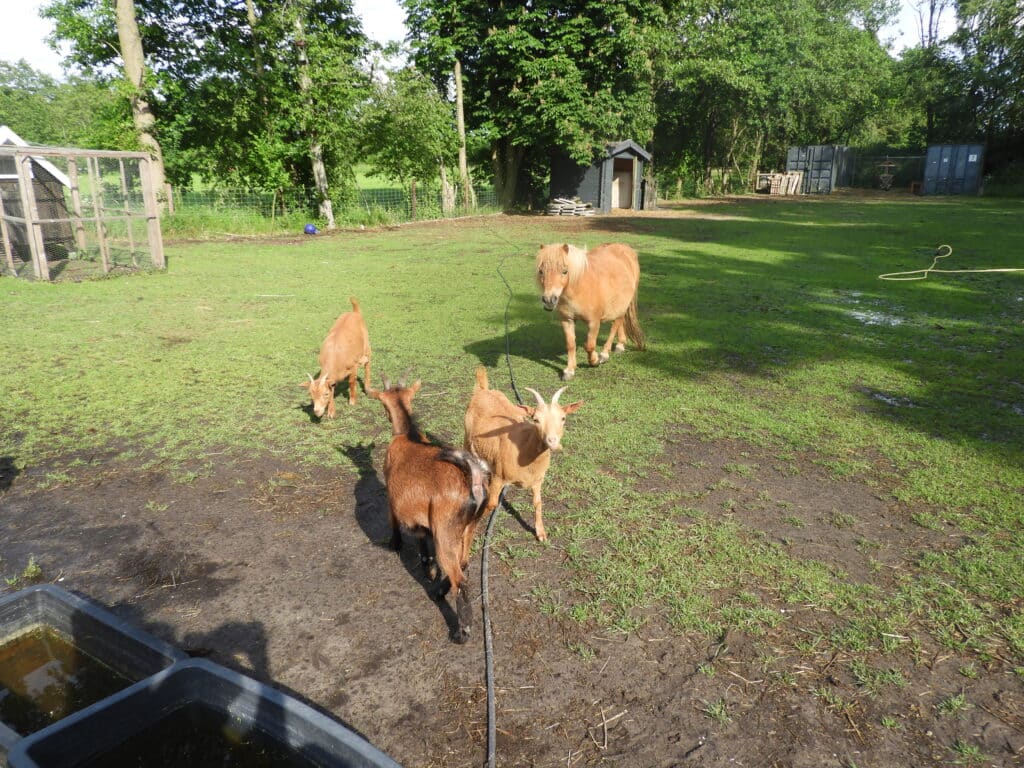 Bij de geiten hebben wij het bokje laten castreren zodat hij gewoon bij zijn zusjes kon blijven. En onze Pinky en Binky, die genieten als ze in een modderbad kunnen gaan.