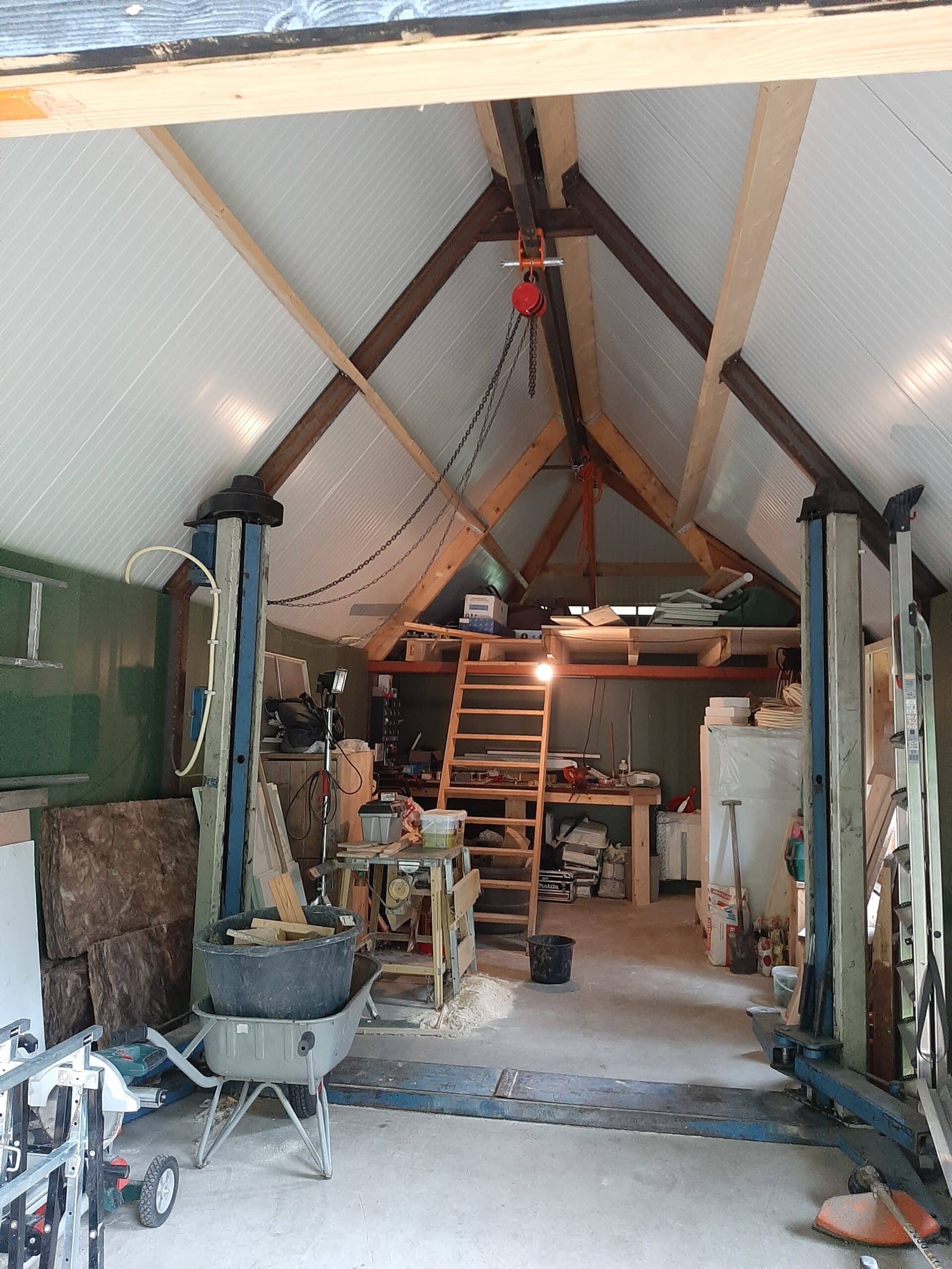 We hebben een werkplaats die is voorzien van een stalen constructie. Er staat een autobrug in met een takel in de nok van het dak voor het zware werk, die van voor naar achter in de garage kan komen. Daarnaast staat er natuurlijk een ruime werkbank en is er veel werk ruimte.