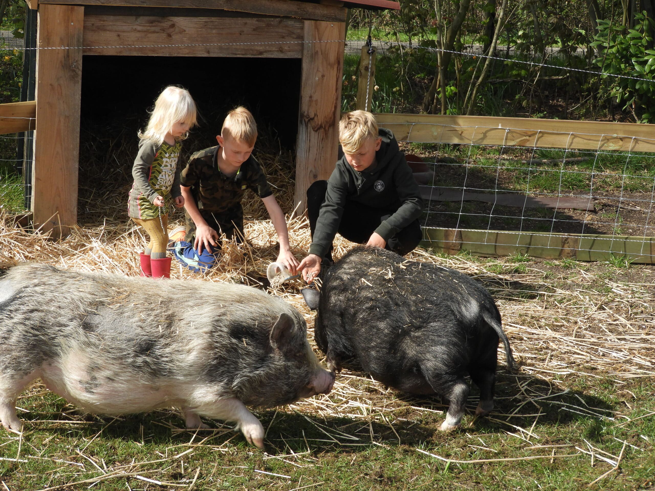 - De verzorging van de dieren; pony’s borstelen en met ze wandelen. Geiten, varkens en kippen eten en drinken geven.