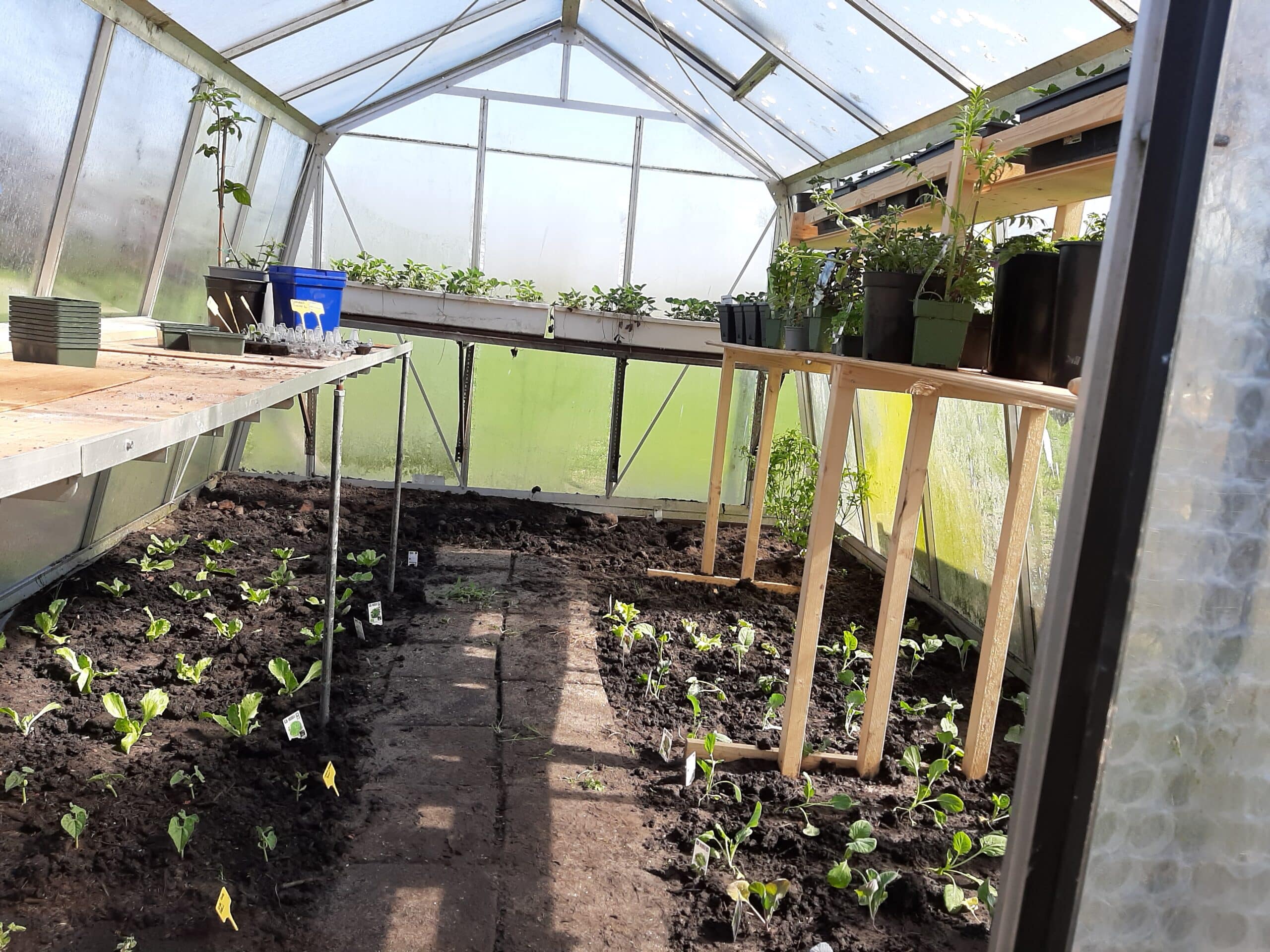 In de kas kun je zaaien en daarna verspenen van de groenten. Vervolgens kan de groente in de groentetuin geplant worden.